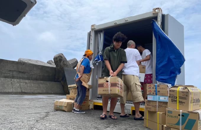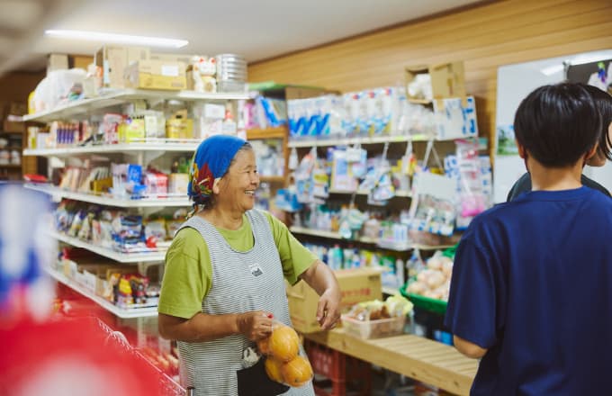 週1回の貨物船「丸一商店」や「西川商店」に並ぶ商品を運んでくるのが、週1回の貨物船。着港した後は、お店の商品棚が充実します。島民(お客様)が荷出しや陳列を手伝うその姿は、みくら島の風物詩。