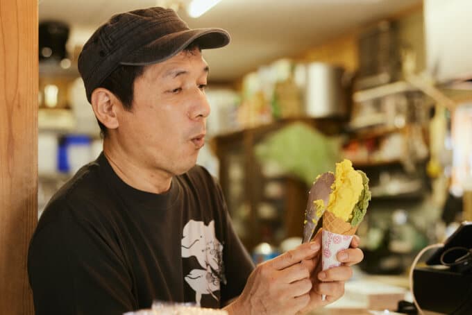 島唯一のおみやげ屋「ふくまる商店」の店主。出身は兵庫県伊丹市。ご夫婦ともにデザイン経験があり、店内の商品パッケージからイルカグッズまで自分たちでデザイン。地元食材を使った明日葉ジェラートなどオリジナル商品も生み出す。